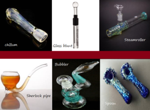 - Glass blunt : These pipes are small in size. They are discreet and effective, but have a bit more complex engineering and functionality. Glass blunts usually have two tubes, one of which pushes the herbs to the end of the pipe for lighting. The moving parts are usually held securely by rubber rings or joints.